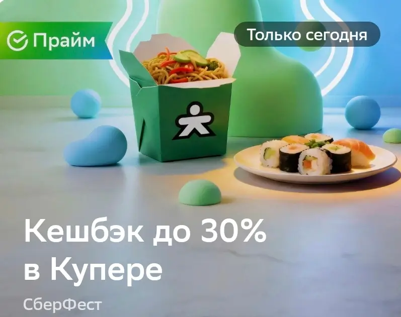 Только сегодня, 22 января, в рамках акции СберФест получите кешбэк до 30% на один заказ в Купере. Для участия необходимо: войти в мобильное приложение банка, перейти в раздел - для жизни, активировать предложение, оплатить покупку картой Сбера. Не забываем авторизоваться в Купере по Сбер ID для начисления бонусов.