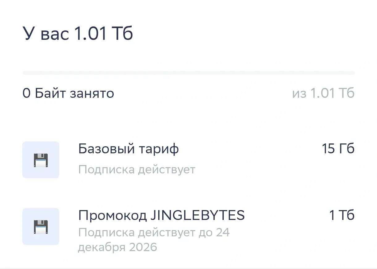 Получите 1 ТБ облачного хранилища СберДиск на год бесплатно. Для подключения: переходим по ссылке авторизовываемся через сбер ID. С левой стороны нажимаем три полоски, увеличить и вводим промокод JINGLEBYTES. Всё 1ТБ на год ваш.