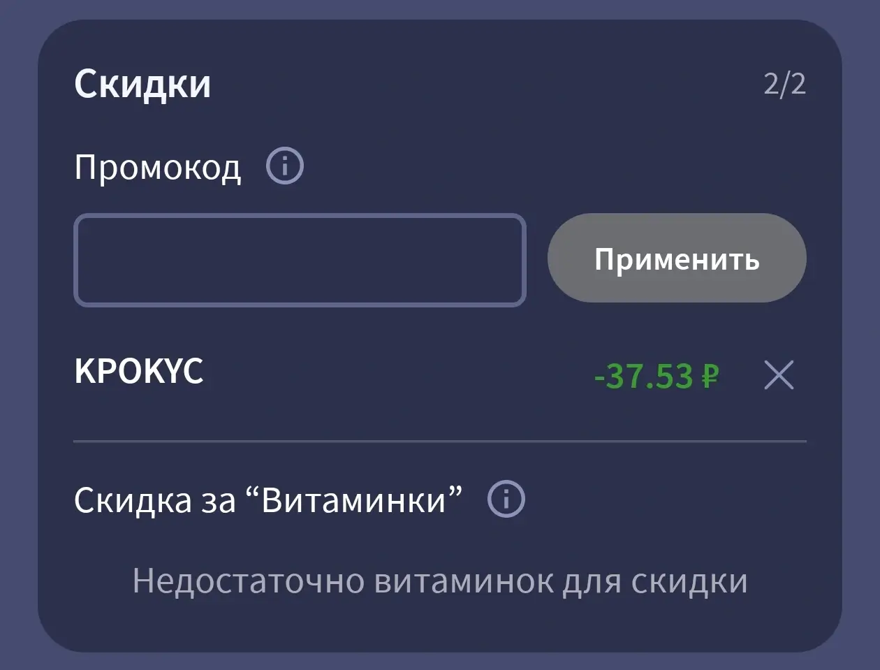 Воспользоваться скидкой по промокоду можно только один раз в течение месяца, без минимальной суммы заказа.