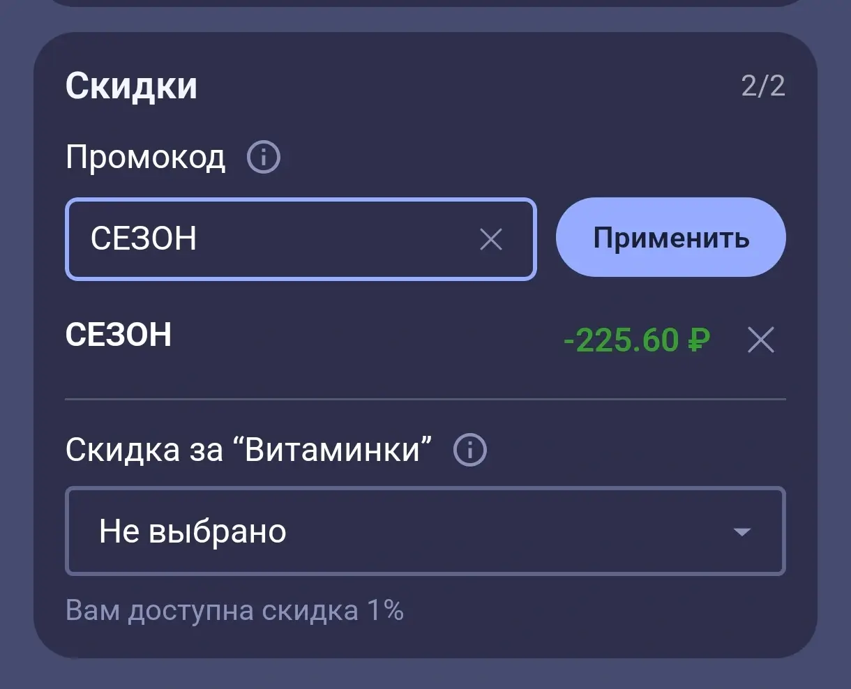 Скидка применяется только к одному заказу в период действия промокода.