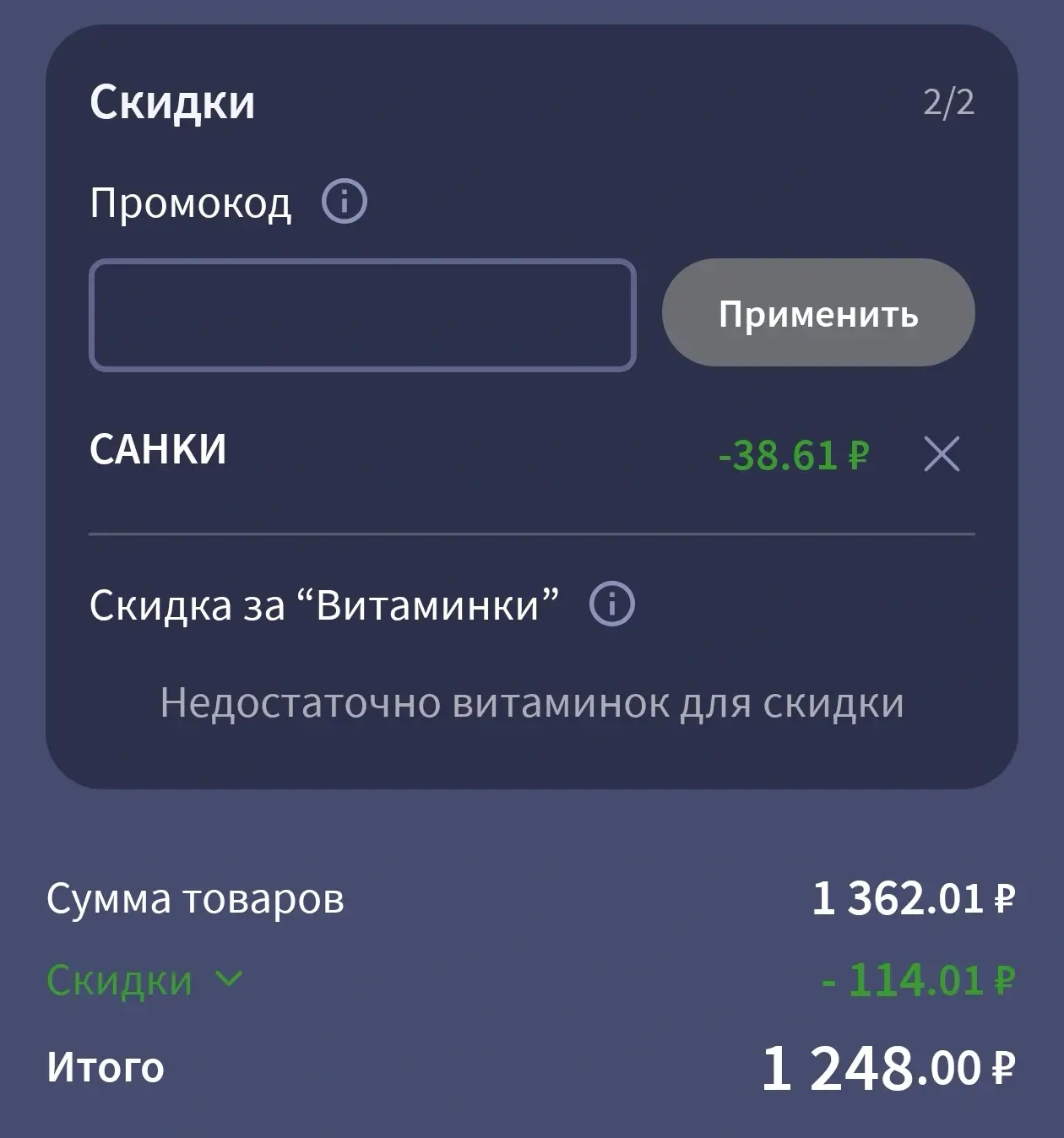 Скидка по промокоду действует один раз в течение месяца, без минимальной суммы заказа.