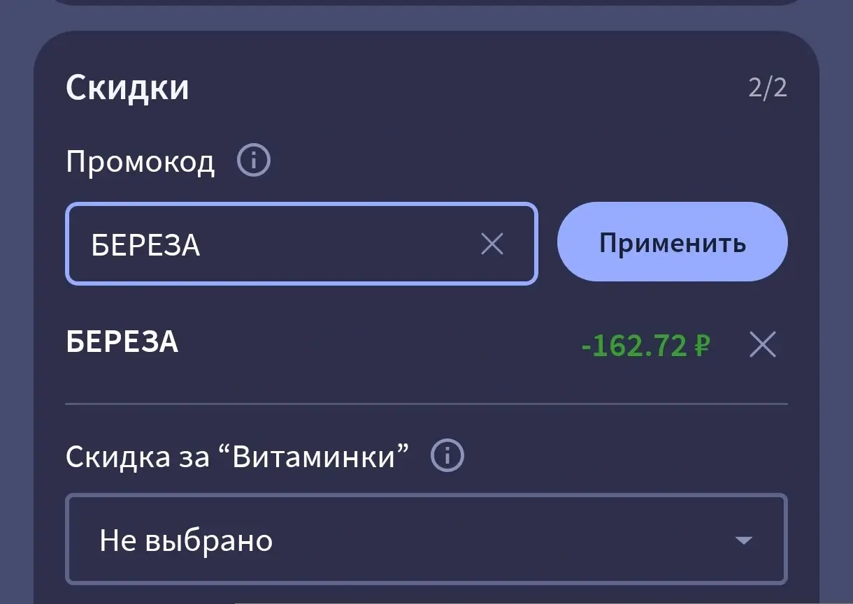 Скидка по промокоду действует один раз в течение месяца, без минимальной суммы заказа.