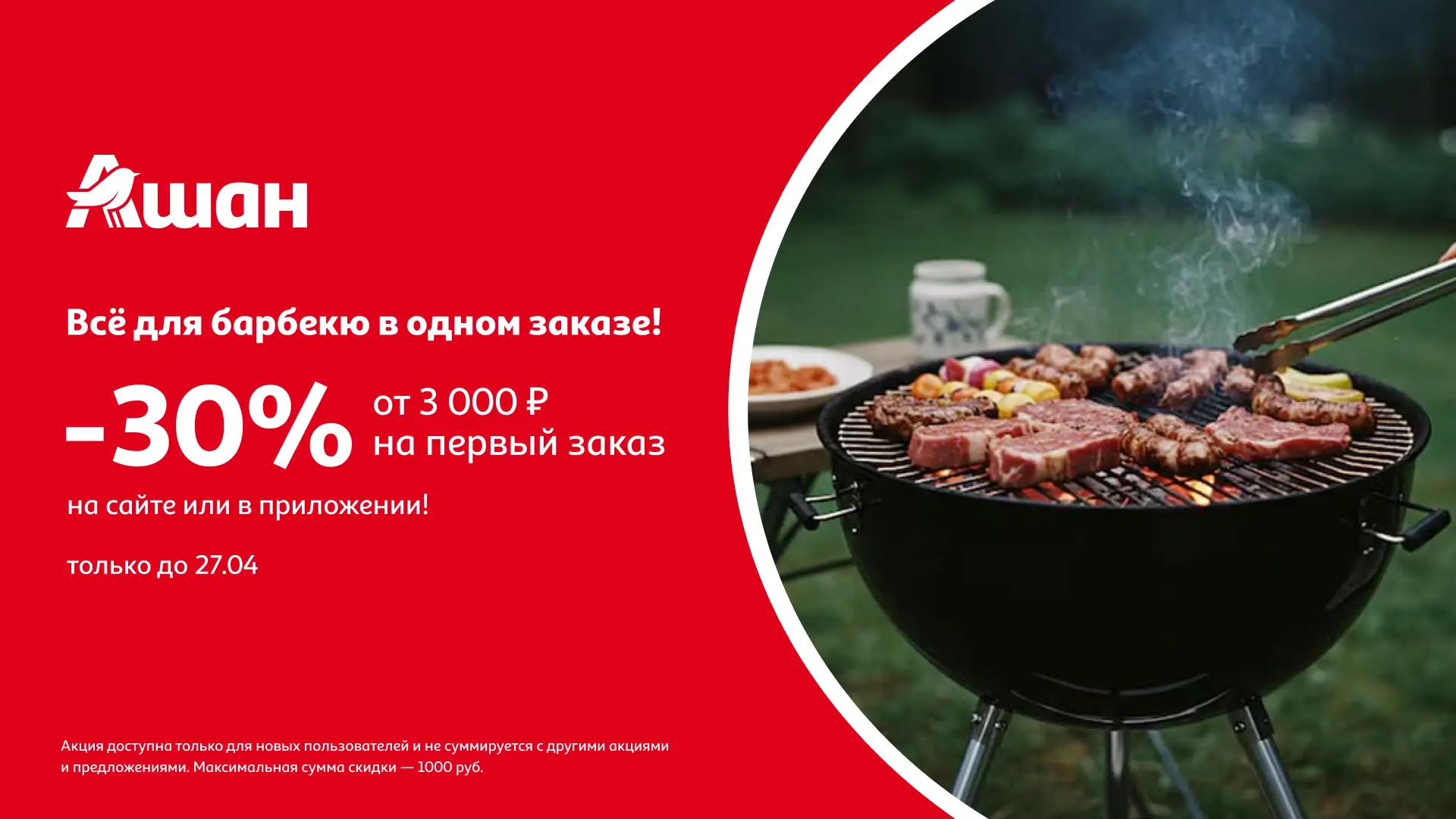 В онлайн-гипермаркете Ашан действует новый промокод, который даёт скидку 30% на первый онлайн-заказ от 3000 рублей. Максимальная сумма скидки — 1000 рублей.