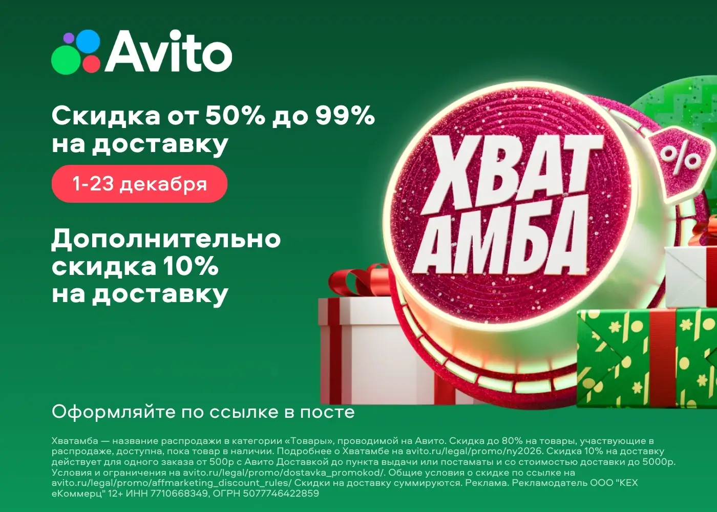 До 31 декабря в рамках акции «Новогодняя Хватамба» Авито дарит скидку 10% на доставку по специальному промокоду. Это отличный шанс сэкономить на каждой покупке с использованием сервиса «Авито Доставка».