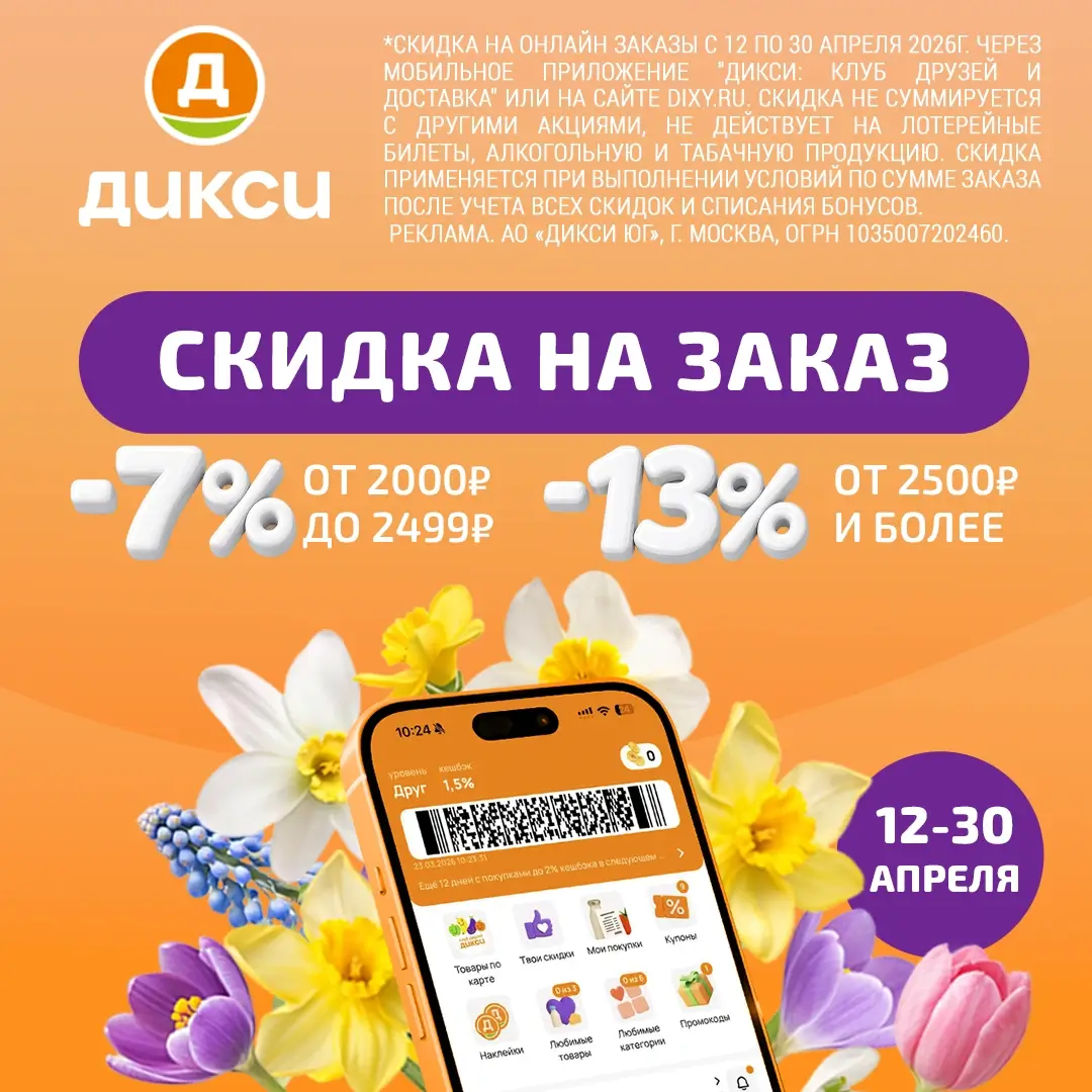 В мобильном приложении «Дикси» появился новый промокод на дополнительную скидку до 13% в зависимости от суммы чека. При заказе от 2000 рублей скидка составит 7%, а при покупке от 2500 рублей — уже 13%.