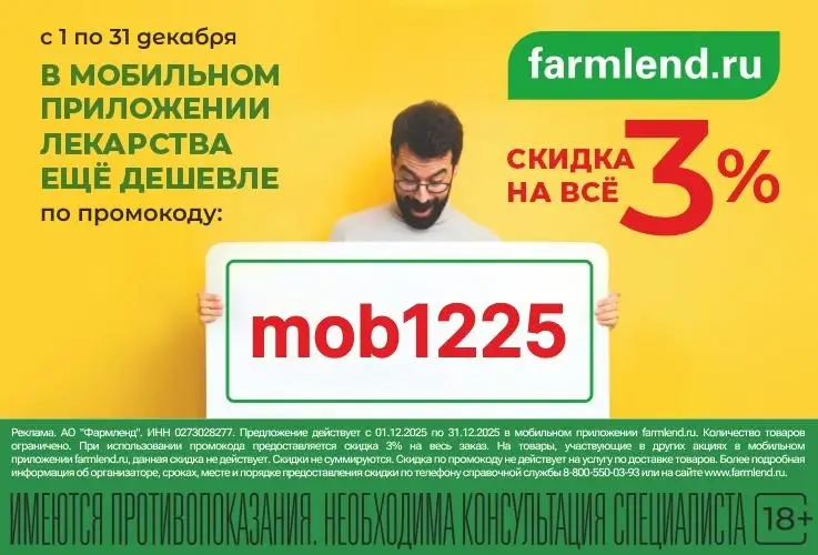До 31 декабря 2025 года, при заказе через мобильное приложение аптеки «Фармленд», можно применить промокод mob1225 и получить дополнительную скидку 3%.