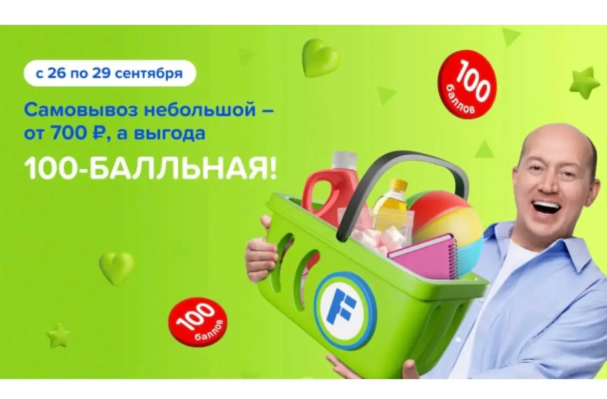 Четыре дня, с 26 по 29 сентября включительно, оформите заказ с самовывозом на сумму не менее 700 рублей в Fix Price. Оплатите в магазине и получите его в период действия акции, за это вам начислят 100 баллов.