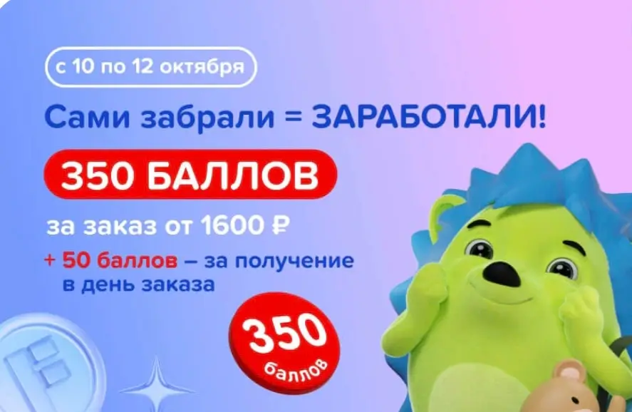 С 10 по 12 октября включительно, при оформлении заказа с самовывозом от 1600 рублей на сайте или в мобильном приложении Fix Price получите промокод на 300 баллов. Для этого оплатите и заберите его в магазине в период проведения акции. А при выкупе заказа в день оформления получите дополнительно еще 50 баллов!