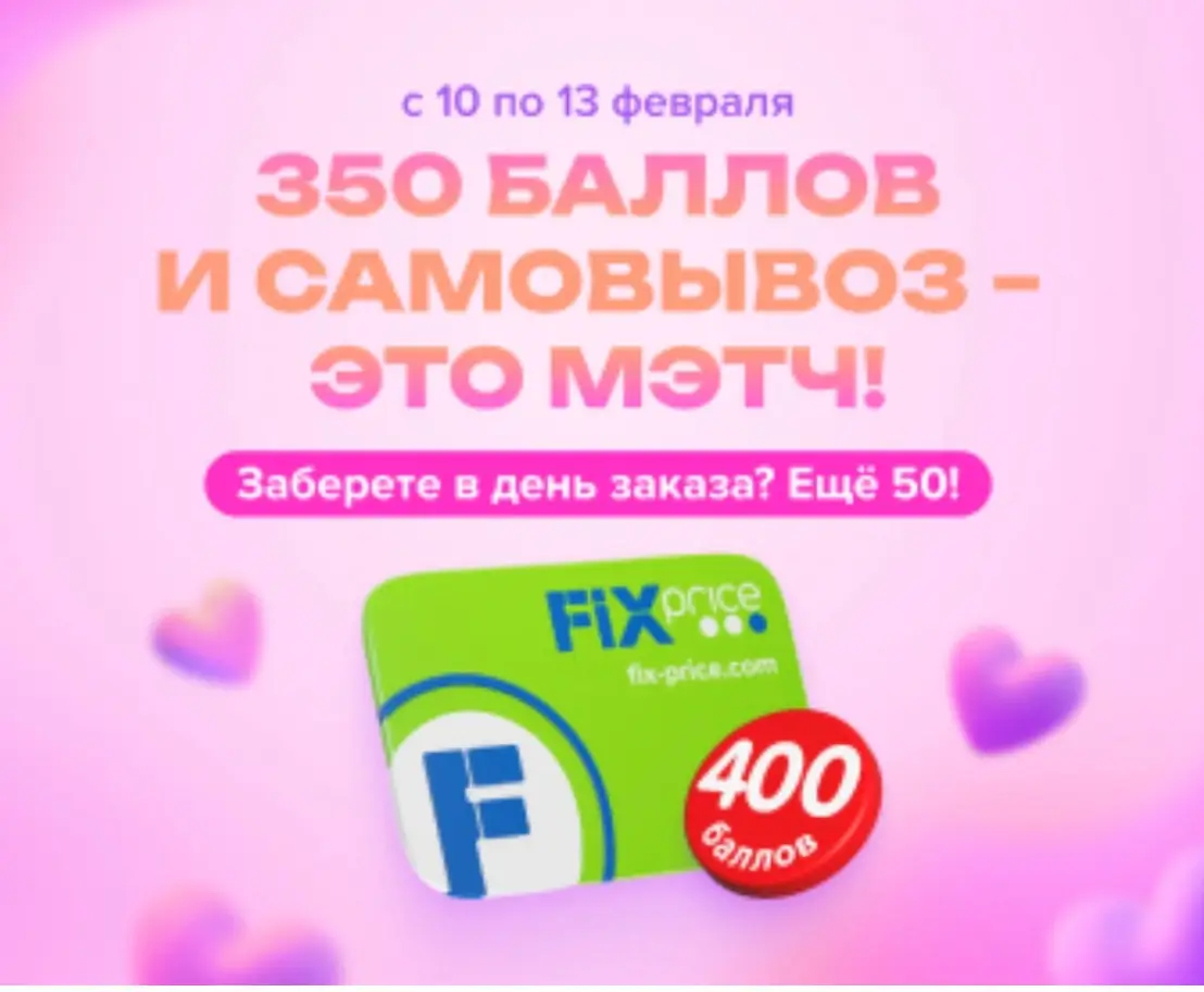 До 13 февраля включительно, оформите заказ с самовывозом на сумму не менее 1600 рублей, в мобильном приложении или на сайте Fix Price и получите промокод на скидку 350 баллов. При выкупе заказа в день оформления дополнительно получите 50 баллов.