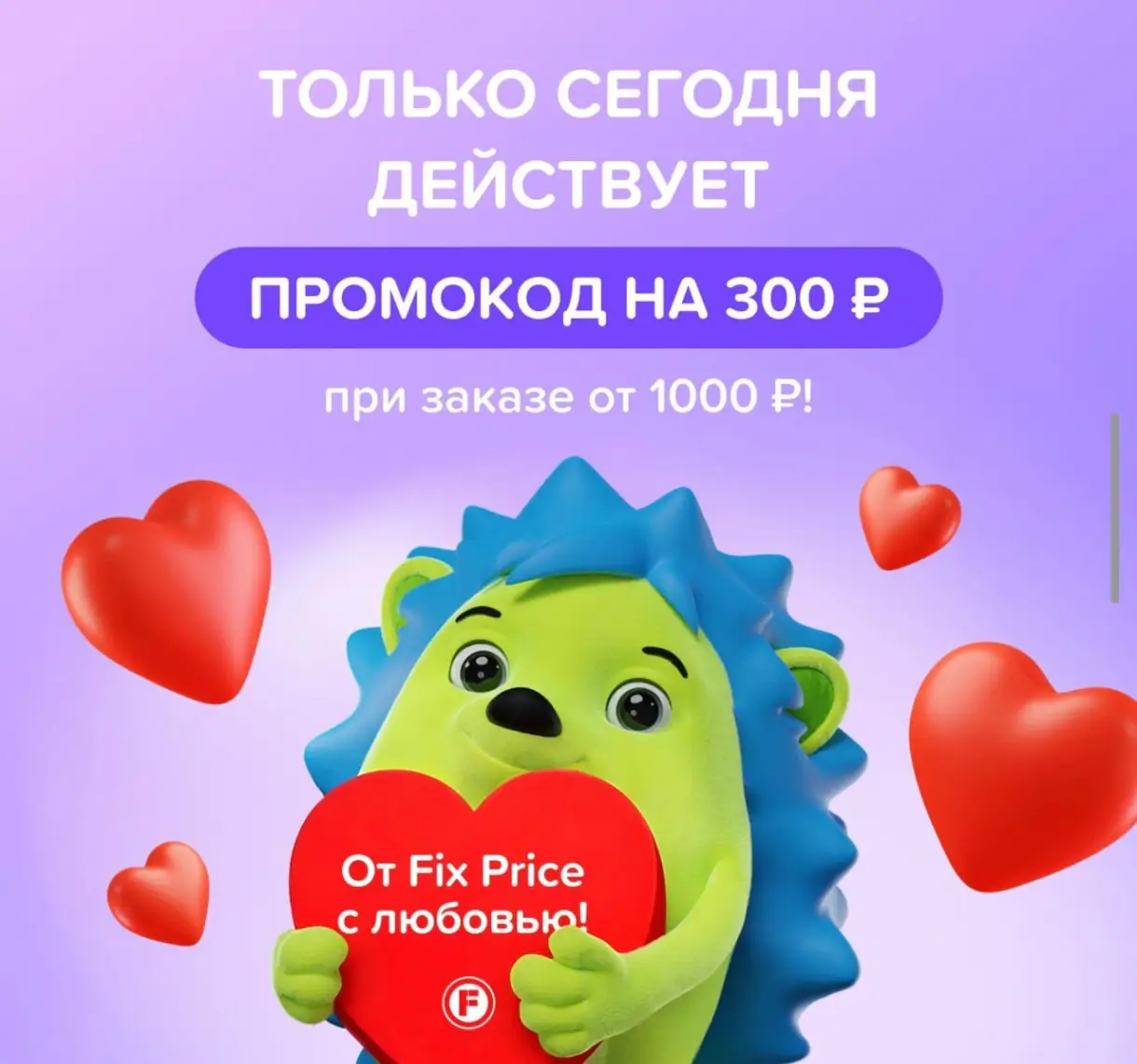 Только сегодня, 14 февраля, вы можете воспользоваться промокодом Е-ЛЮБОВЬ в мобильном приложении или на сайте Fix Price для получения скидки 300 рублей при заказе на сумму от 1000 рублей. Промокод действует на заказы с доставкой и самовывозом.