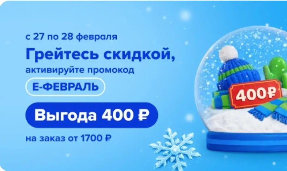 Два дня, 27 и 28 февраля включительно, получите дополнительную скидку 400 рублей по промокоду Е-ФЕВРАЛЬ при оформлении заказа в мобильном приложении или на сайте Fix Price, скидка действует при заказе от 1700 рублей, распространяется на доставку, экспресс-доставку и самовывоз.