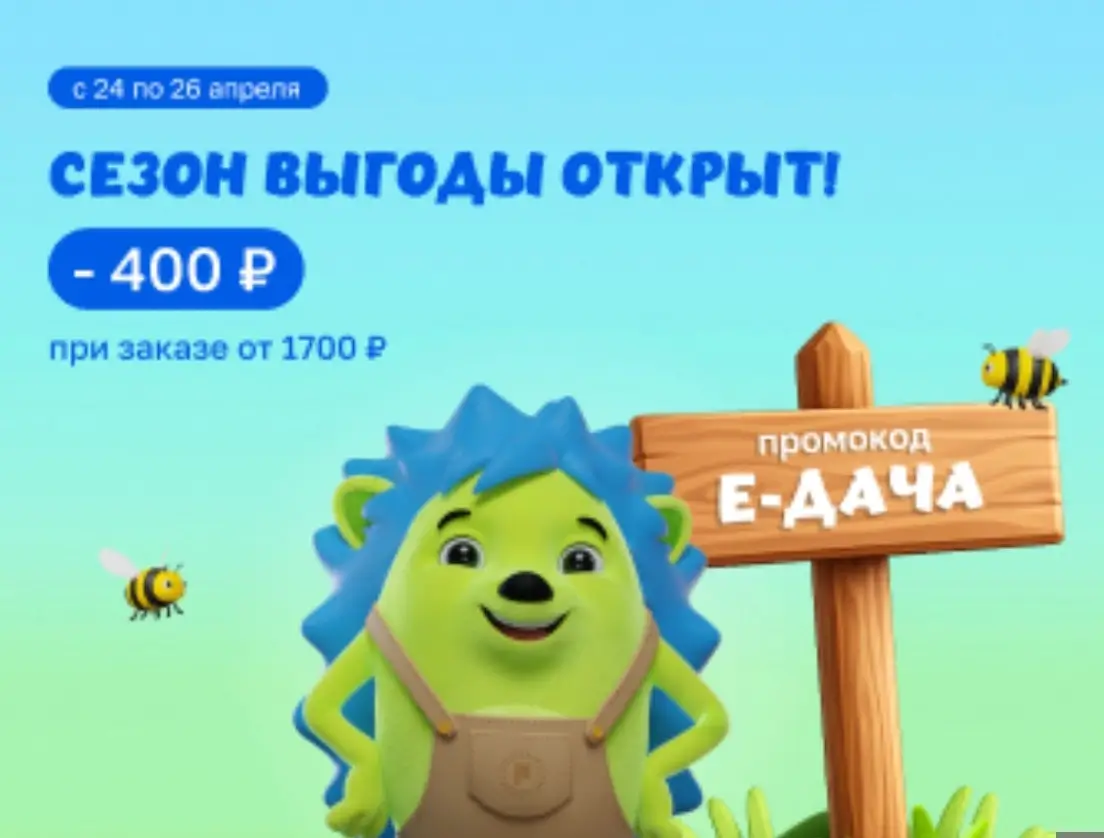 С 24 по 26 апреля вы можете получить дополнительную скидку 400 рублей применив промокод Е-ДАЧА при оформлении заказа в мобильном приложении или на сайте Fix Price. Промокод действует при заказе от 1700 рублей, распространяется на доставку и самовывоз.