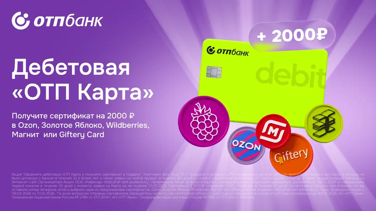 Оформите дебетовую ОТП Карту по уникальной ссылке, совершите покупку на любую сумму в течение 30 дней и получите в подарок сертификат на 2000 ₽. Вы сможете выбрать магазин: Ozon, Wildberries, Золотое Яблоко, Магнит или Giftery.