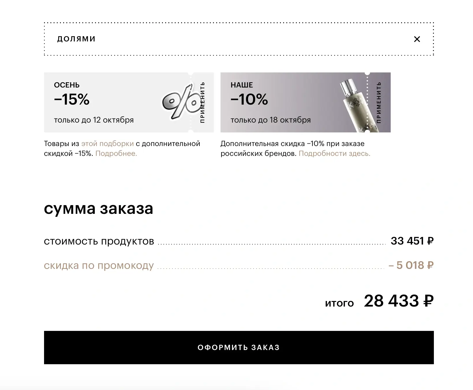 До 5 декабря включительно в интернет-магазине Золотое яблоко действует новый промокод ДОЛЯМИ, который активирует дополнительную скидку 15% на заказ от 8000 рублей.
