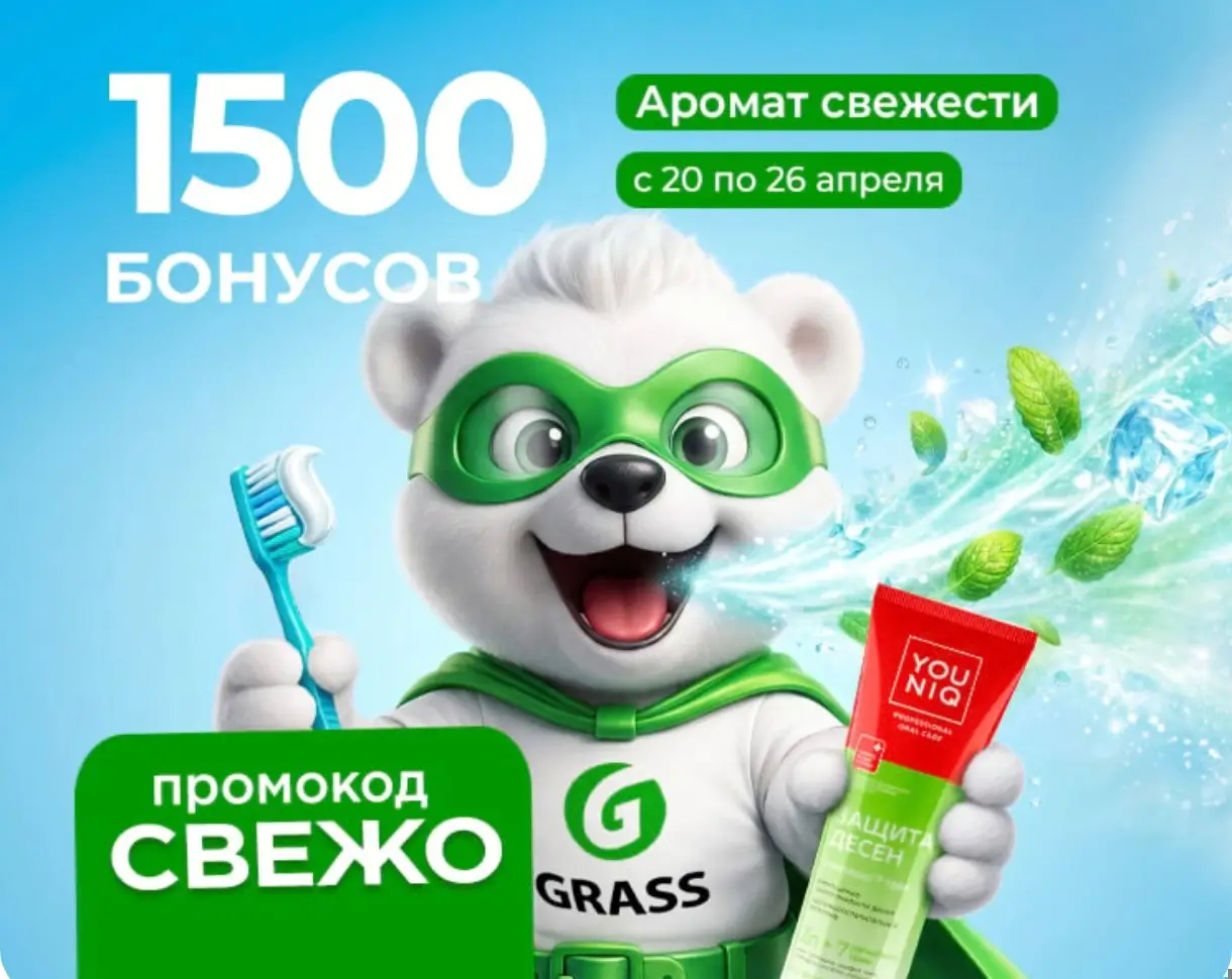 Воспользуйтесь новым промокодом СВЕЖО по которому вы получите 1500 бонусов, их можно потратить в магазине Grass и получить дополнительную скидку до 30% на любой заказ.
