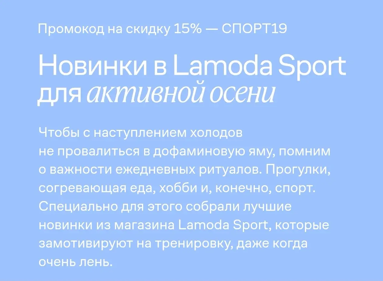До 31 октября 2025 года включительно на Lamoda вы можете получить скидку 15% на любой заказ: для этого введите промокод СПОРТ19 при оформлении заказа.