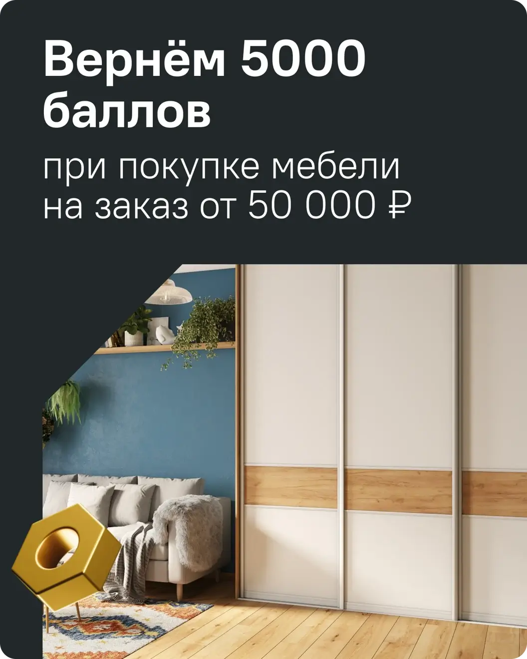До 31 марта в магазинах Лемана ПРО действует специальное предложение. Оно позволяет вернуть 5000 баллов держателям Ключ-карты при заказе шкафов-купе или гардеробных на сумму от 50 000 рублей.