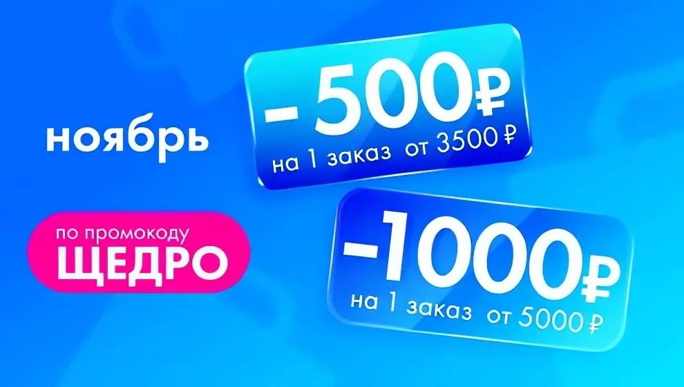 С 18 по 21 ноября, в Ленте Онлайн вы можете воспользоваться новым промокодом ЩЕДРО для получения дополнительной скидки 500 рублей от 3 500 рублей или скидку 1 000 рублей на заказ от 5 000 рублей на 1 заказ доставки.