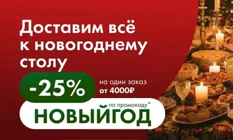 До 25 декабря в Ленте действует праздничное предложение на доставку заказов: в этот период вы можете оформить заказ к новогоднему столу и получить скидку -25% по промокоду.