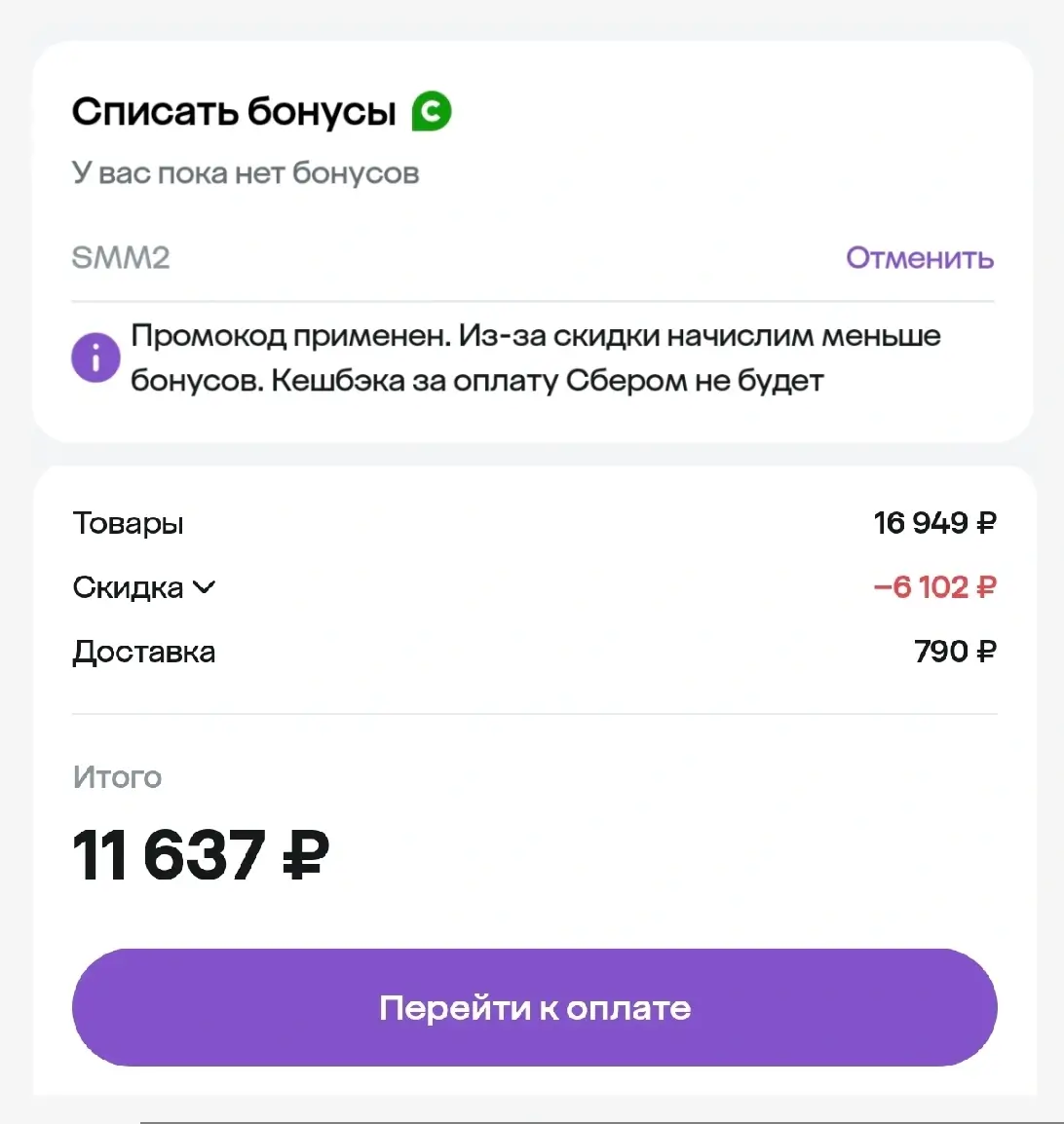 В интернет-магазине Мегамаркет вы можете воспользоваться промокодом SMM2, по которому вам будет доступна дополнительная скидка 20%, но не более 5000 рублей на товары из выделенного ассортимента из разных категорий.