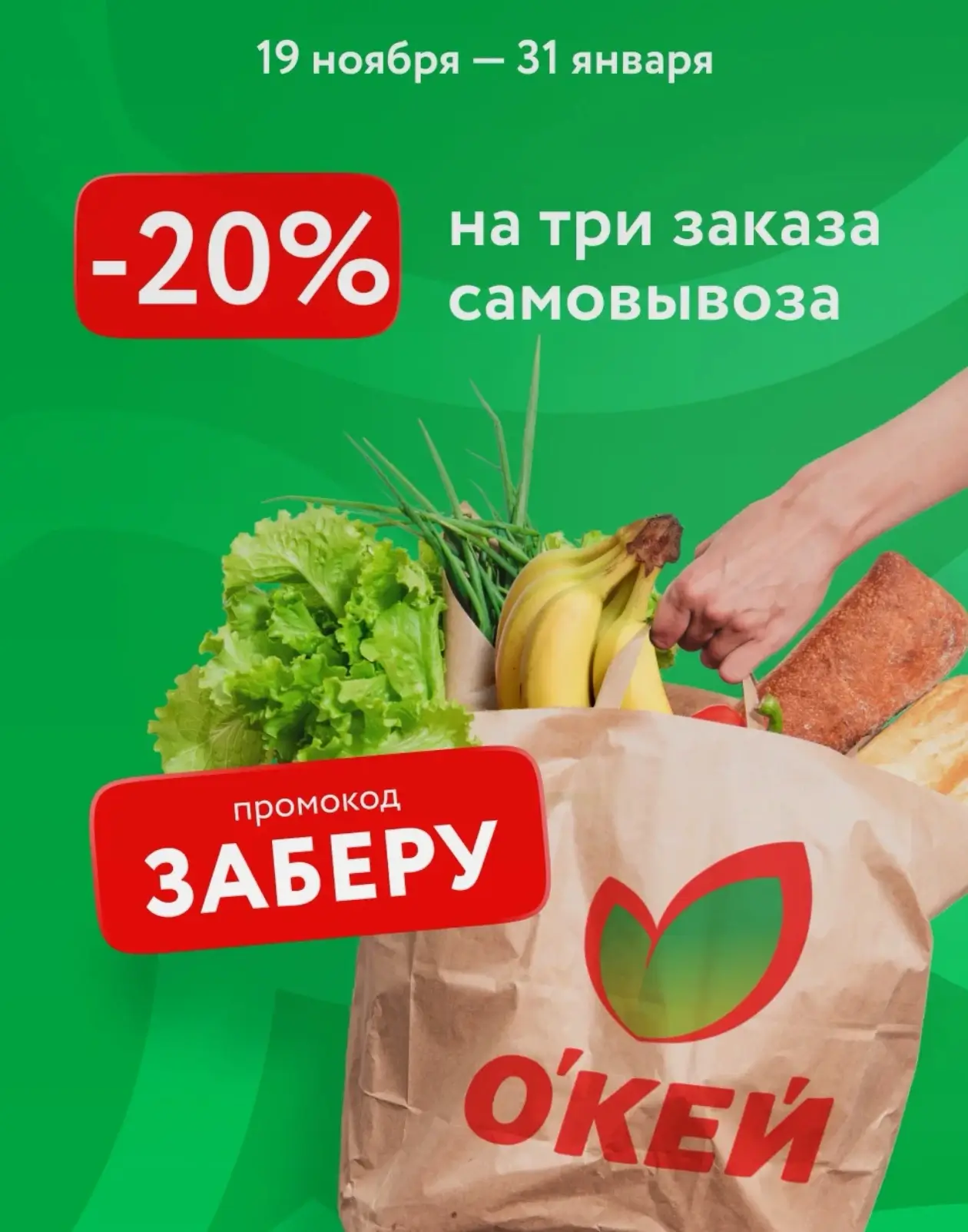 До 31 января 2026 года получите дополнительную скидку 20% на три заказа с самовывозом в гипермаркет О'кей по промокоду Заберу.