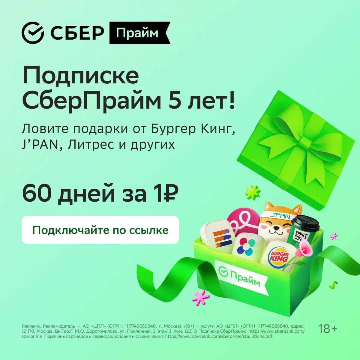 Только до 31 октября 2025 года действуют специальные условия на подписку СберПрайм. При переходе по ссылке доступно два варианта: новые пользователи могут получить подписку на 60 дней за 1 рубль, а для остальных пользователей предусмотрена годовая подписка стоимостью 249 рублей в месяц.