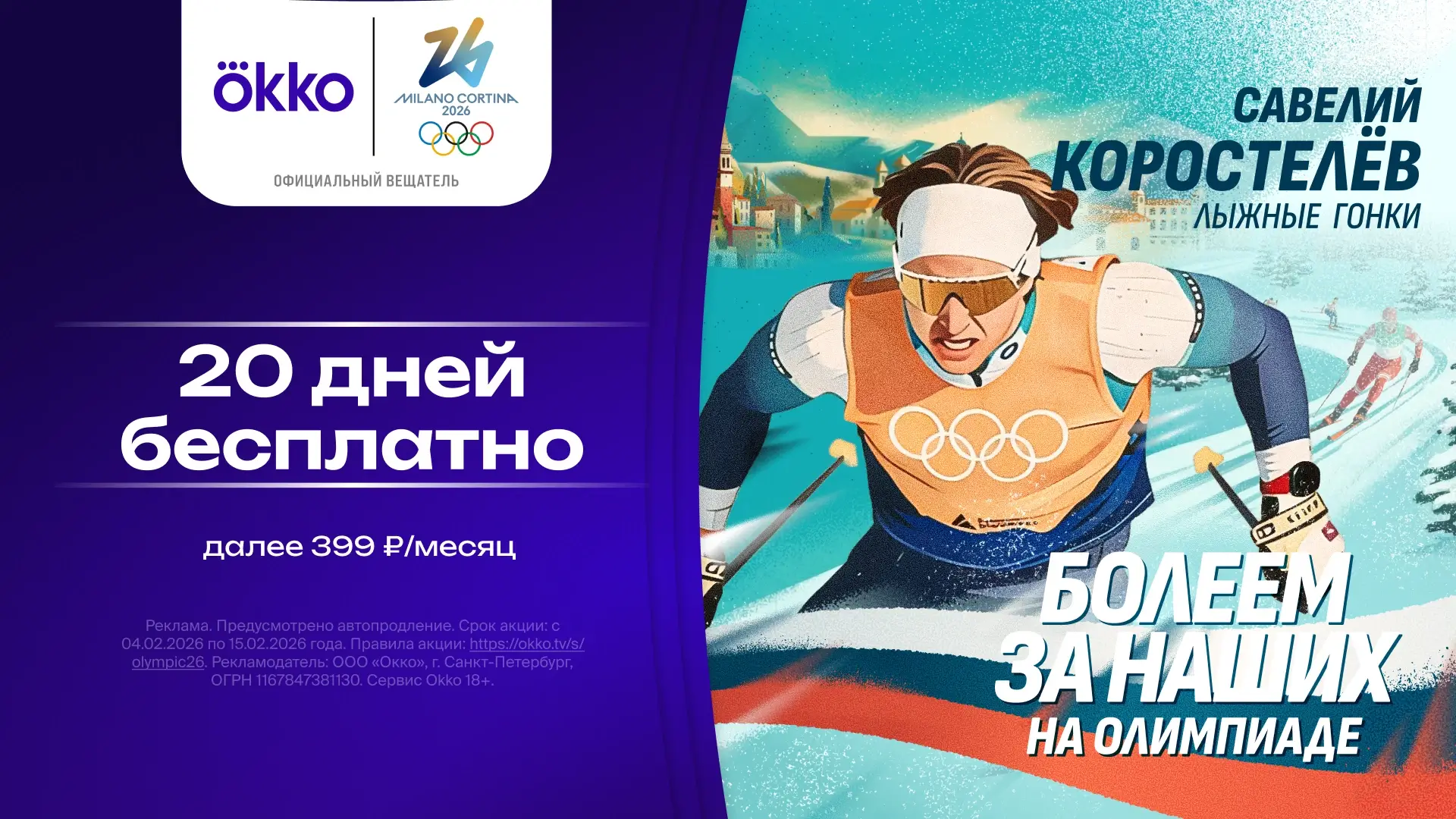 С 5 по 15 февраля 2026 года действует специальное предложение для всех пользователей: перейдя по уникальной ссылке, можно активировать 20 дней бесплатного доступа к онлайн-кинотеатру Okko, а также подписке СберПрайм. Предложение доступно для регистрации как на сайте, так и в мобильной версии онлайн-кинотеатра.
