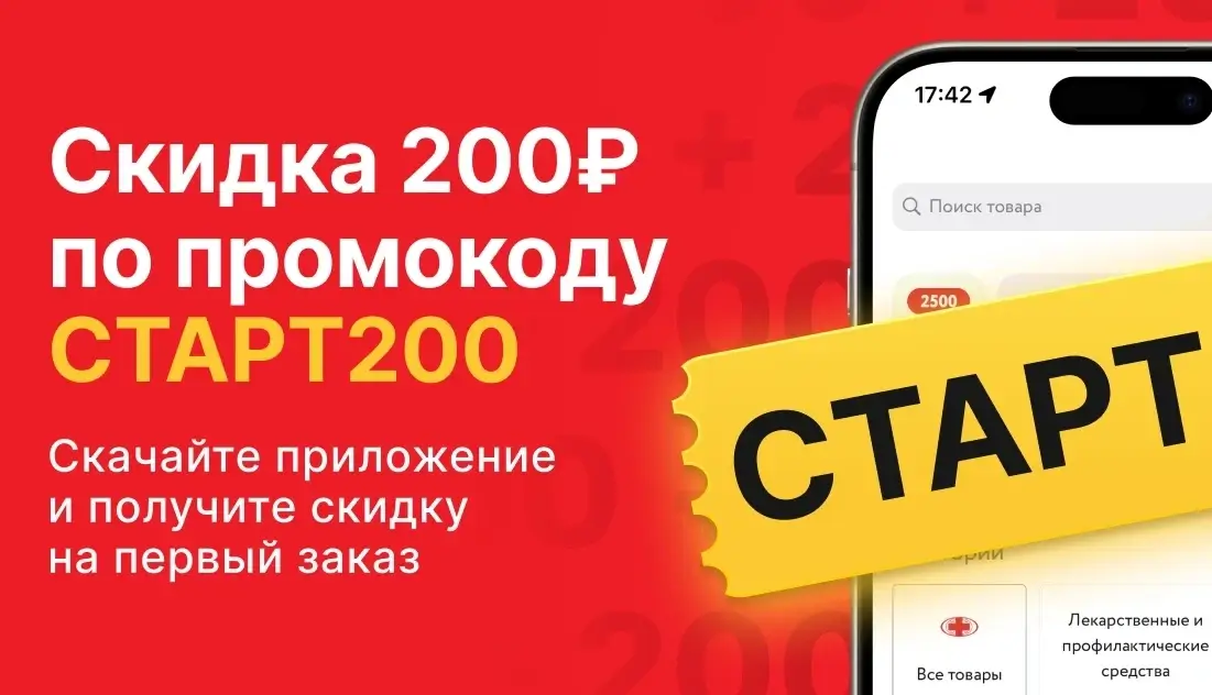 С 1 января по 31 декабря 2026 года в аптечной сети «Озерки» действует промокод СТАРТ200. Он даёт скидку 200 рублей на первый заказ в мобильном приложении при условии, что стоимость корзины после списания бонусов программы лояльности составит не менее 1000 рублей. Способ получения — самовывоз из аптеки.