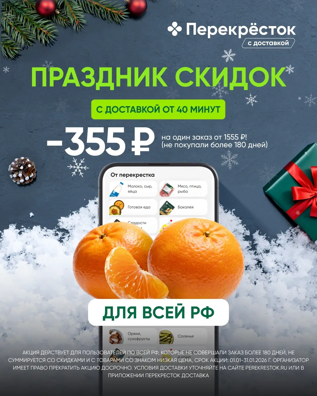 До 31 января 2026 года вы можете получить скидку 355 рублей на заказ в Перекрёстке: для этого оформите доставку продуктов на сумму от 1555 рублей и примените специальный промокод. Это предложение — для клиентов по всей России, которые не пользовались сервисом последние 180 дней.