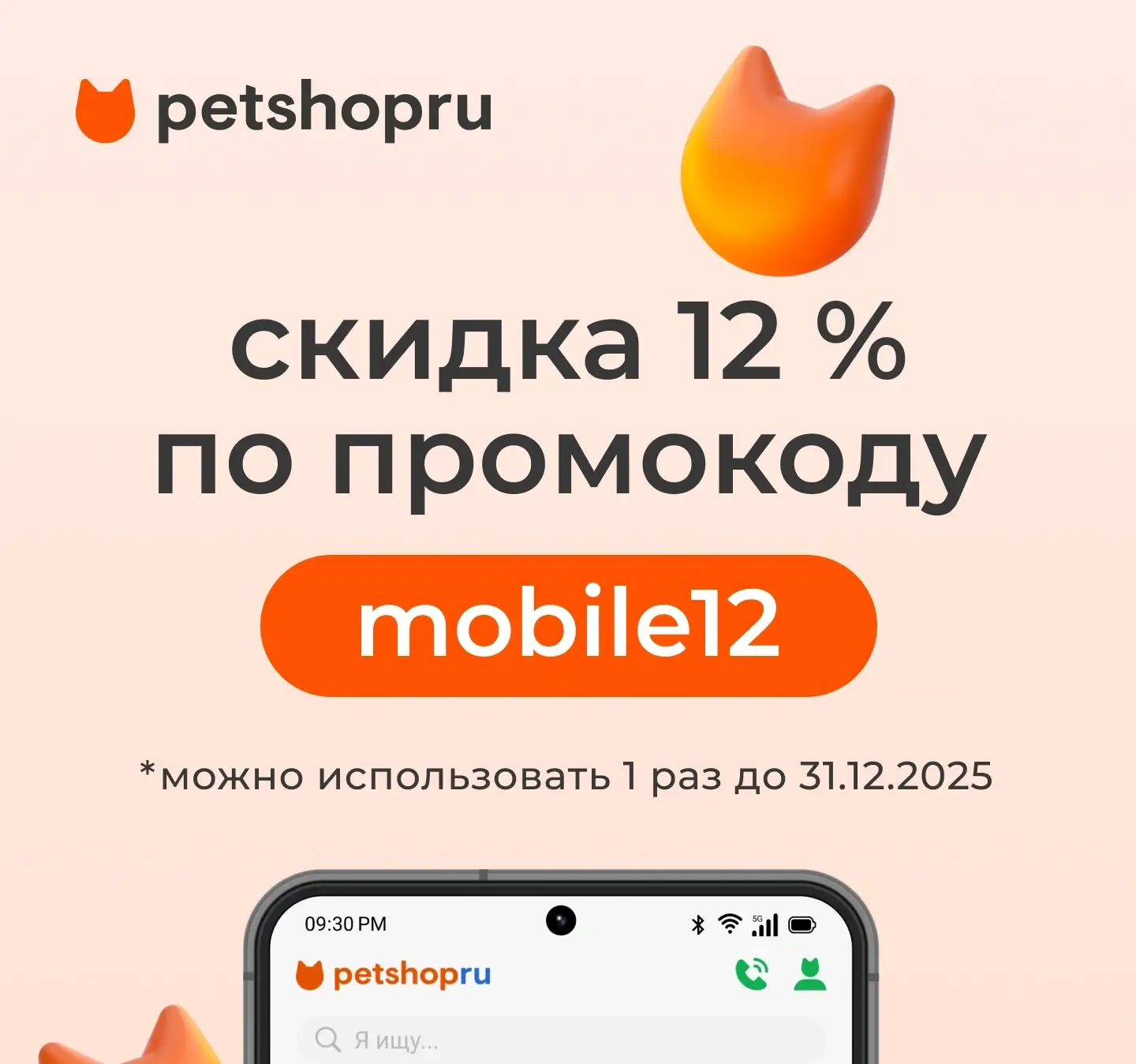До 31 декабря 2025 года успейте воспользоваться новым промокодом mobile12 в интернет-зоомагазине Petshop.ru, чтобы получить дополнительную скидку 12%.