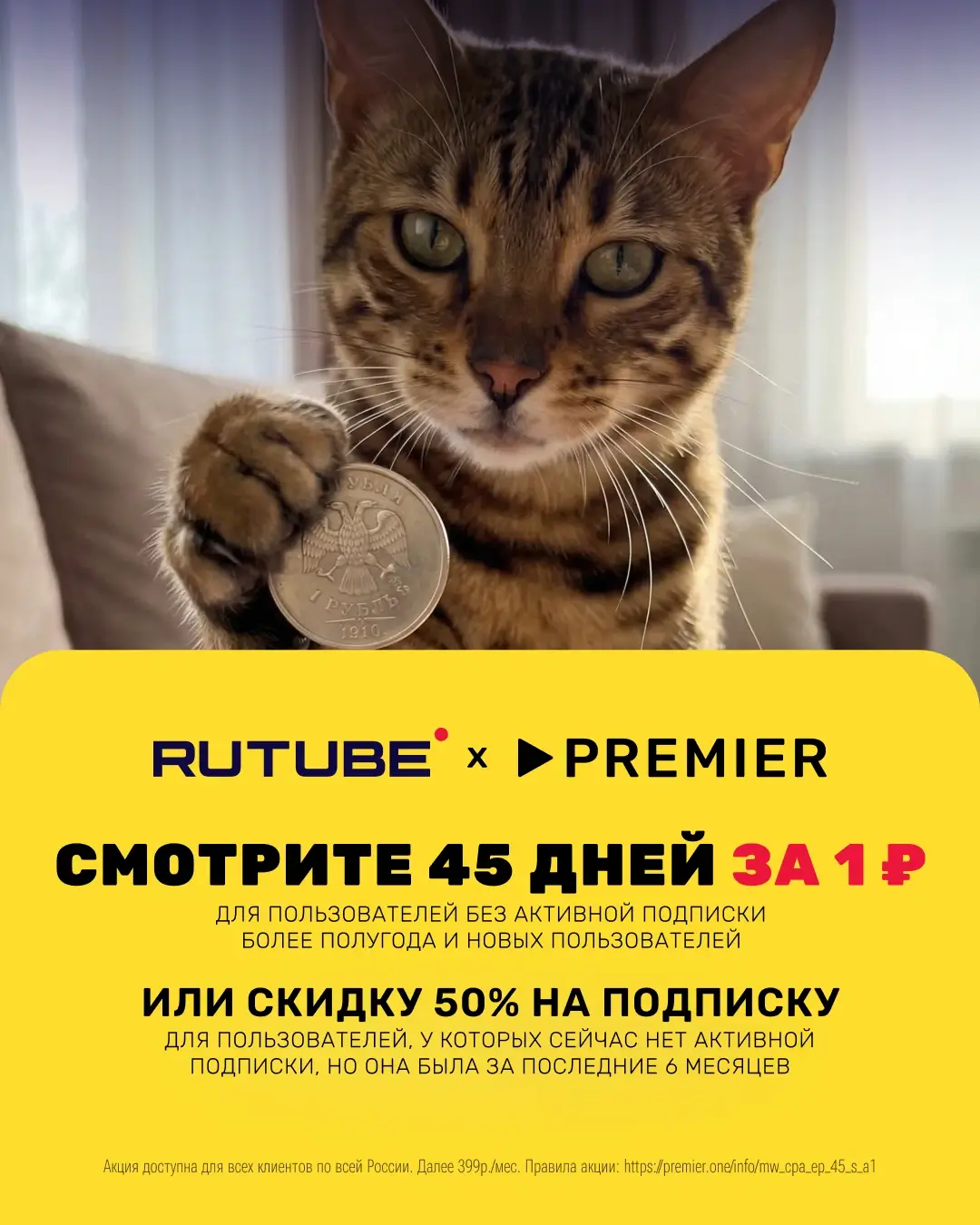 Два онлайн-кинотеатра — PREMIER и RUTUBE — теперь доступны по одной подписке: тем, кто подключается впервые или не пользовался сервисом последние полгода, — 45 дней за 1 рубль. Тем, чья подписка истекла в течение последних шести месяцев, — месяц за 200 рублей вместо 399 рублей.