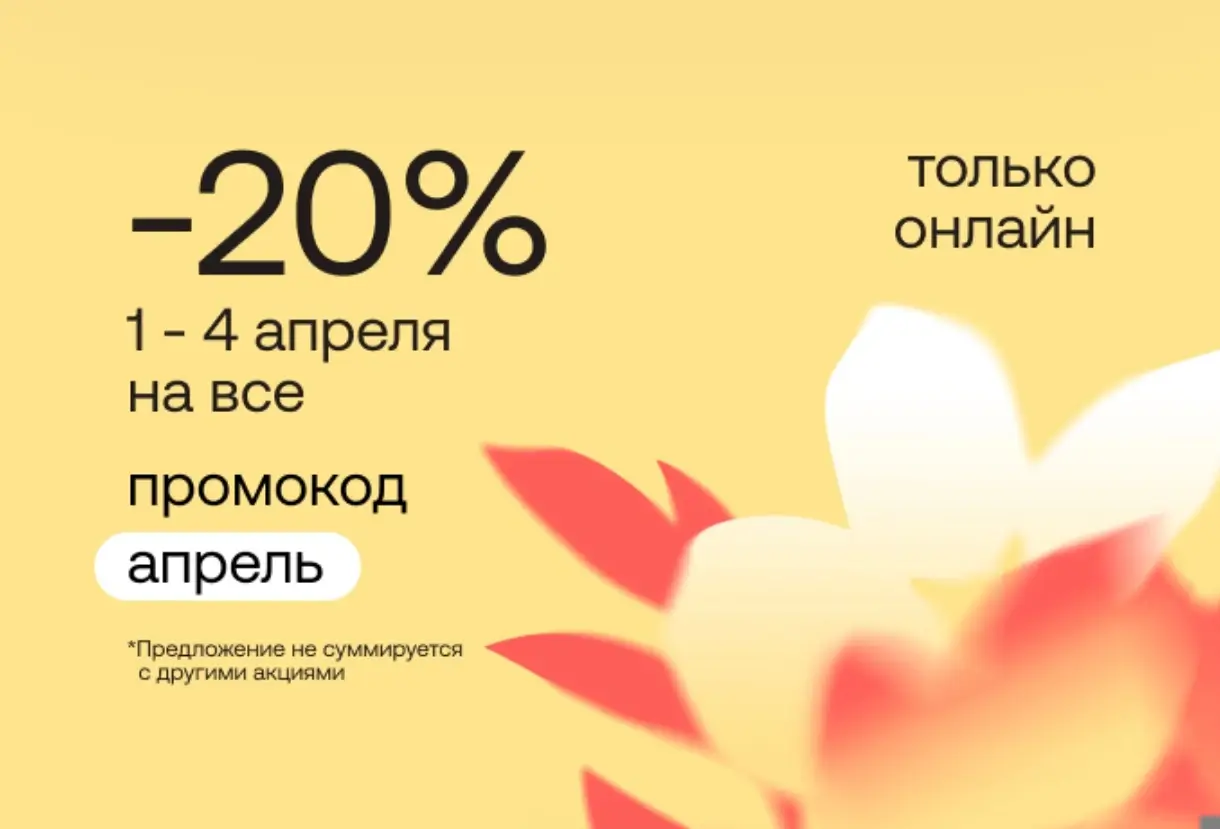 С 1 по 4 апреля включительно, на сайте или мобильном приложении «Улыбка радуги» вы можете воспользоваться скидкой 20% на всё по промокоду "АПРЕЛЬ".