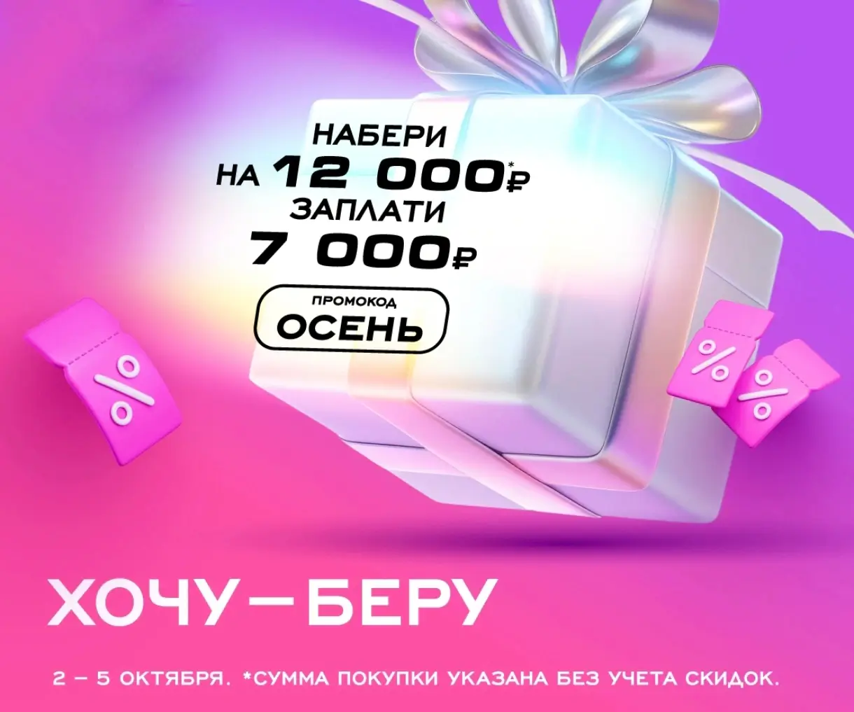С 2 по 5 октября включительно всем пользователям доступен промокод для выгодных покупок в сети РИВ ГОШ - выбирайте парфюмерию и косметику на сумму 12 000 рублей, а платите только 7 000 рублей с преминением промокода ОСЕНЬ.