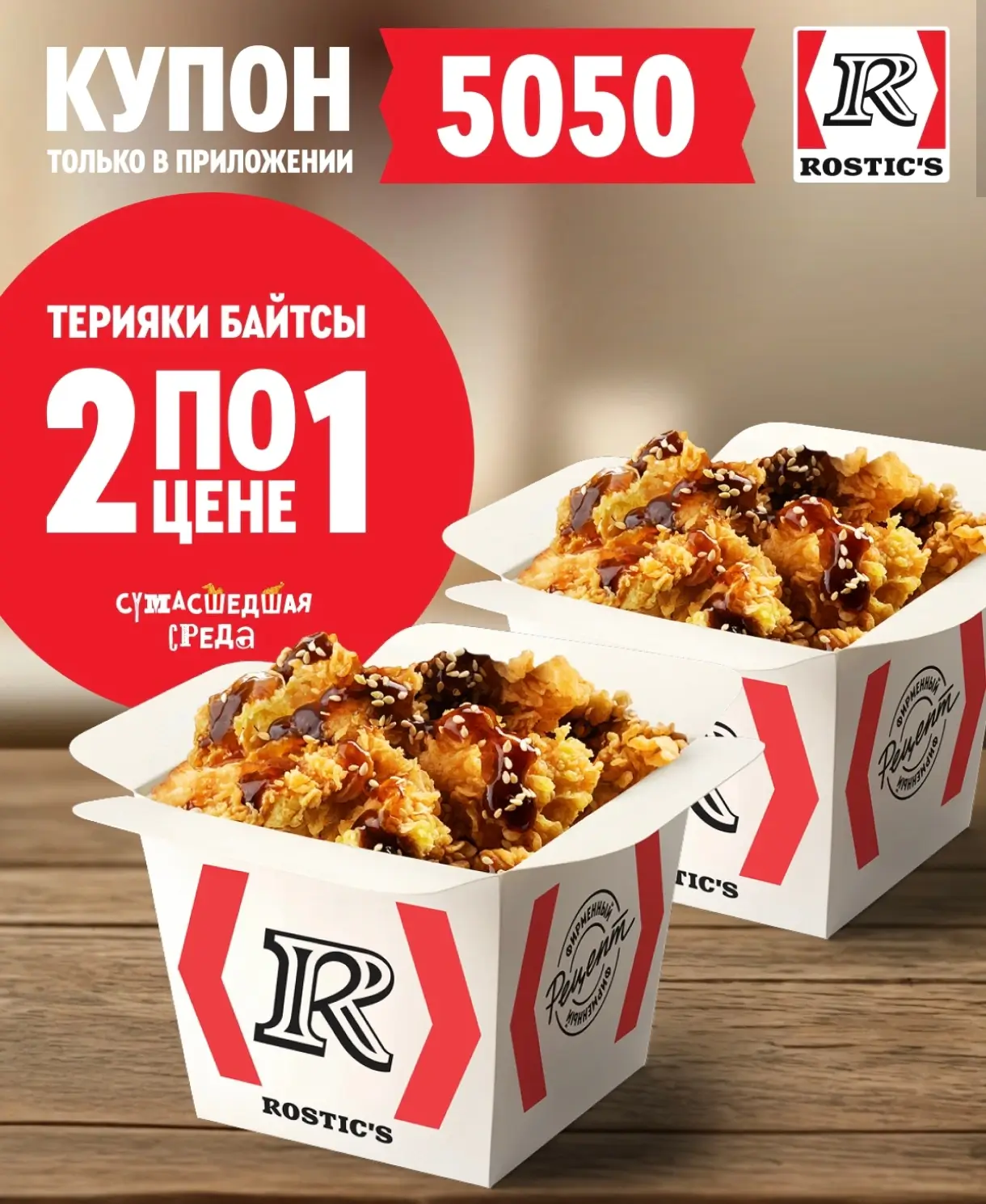 В эту среду, 8 октября, воспользуйтесь купоном 5050 при оформлении заказа в мобильном приложении KFC/ROSTIC'S по которому вы получите Байтсы Терияки два по цене одного.