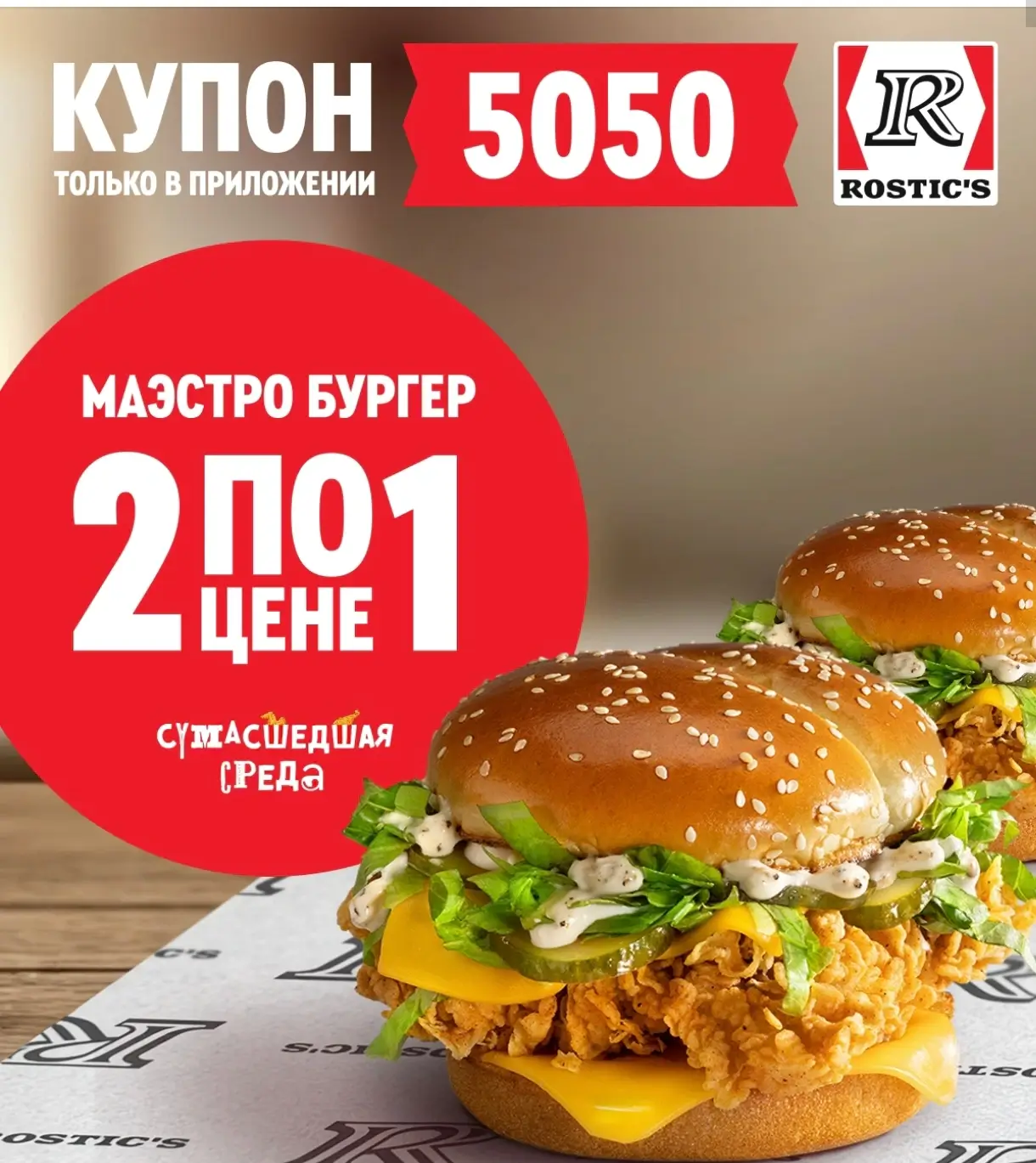 Только в эту среду, 15 октября, воспользуйтесь купоном 5050 при оформлении заказа в мобильном приложении KFC/ROSTIC'S и получите два Маэстро Бургера по цене одного.