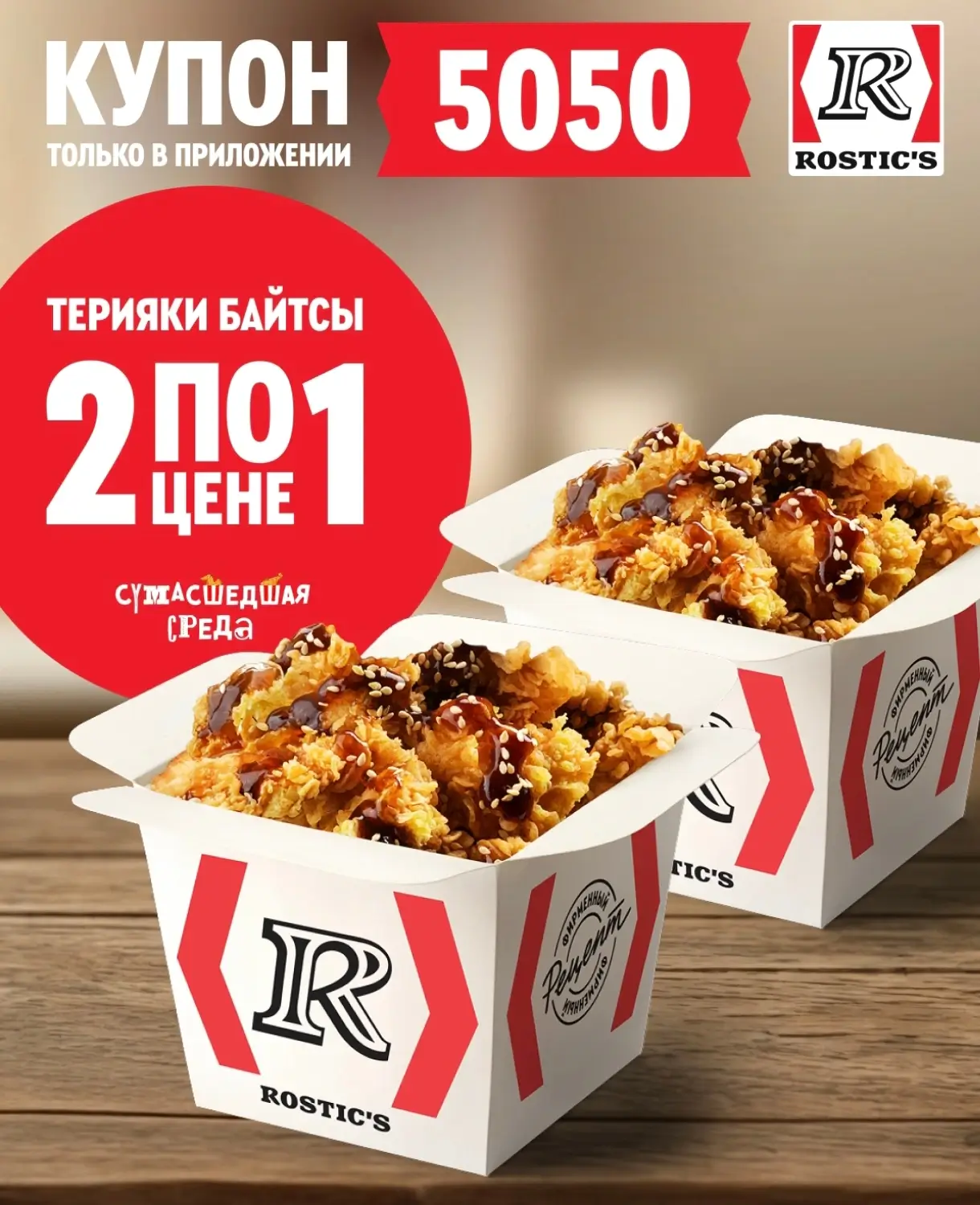 В эту среду, 22 октября, воспользуйтесь купоном 5050 при оформлении заказа в мобильном приложении KFC/ROSTIC'S по которому вы получите Байтсы Терияки два по цене одного.