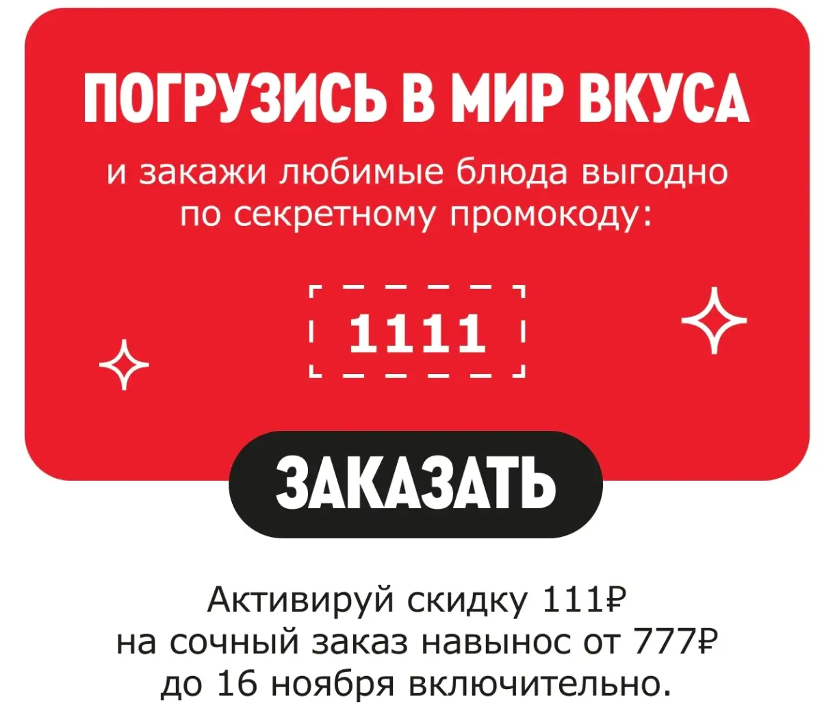 С 11 по 16 ноября включительно в ресторанах KFC и ROSTIC'S действует промокод 1111 по которому вы получите дополнительную скидку 111 рублей при оформлении заказа навынос в мобильном приложении от 777 рублей в мобильном приложении.
