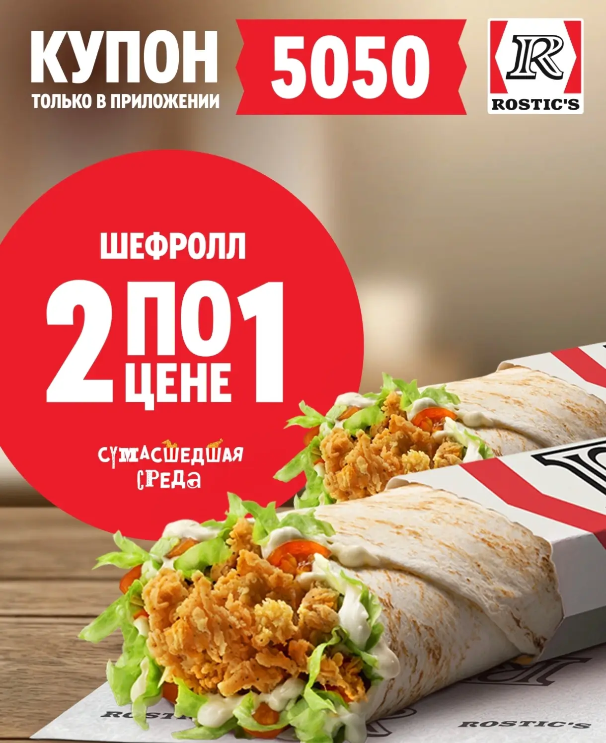 В эту среду, 19 ноября, воспользуйтесь купоном 5050 при оформлении заказа в мобильном приложении KFC/ROSTIC'S и получите два Шефролла по цене одного.