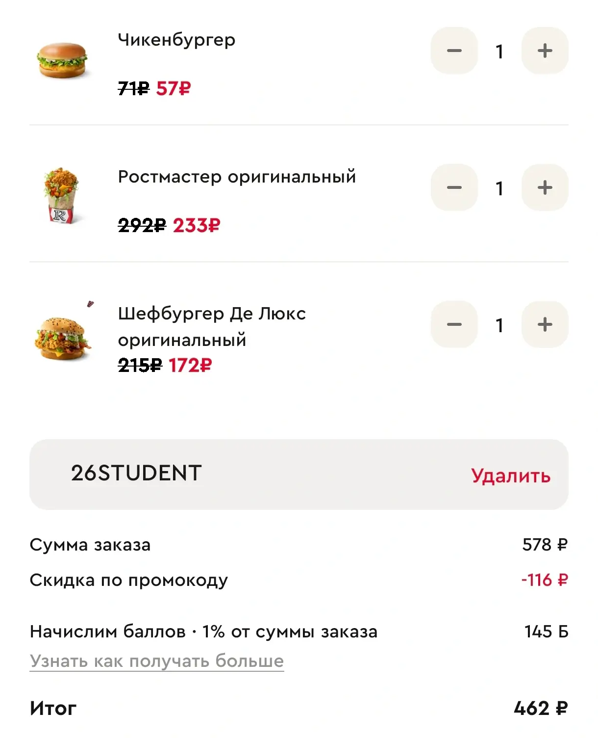 Только сегодня, 25 января, в ресторанах KFC и ROSTIC'S действует промокод 26STUDENT по которому вам станет доступна скидка 20% при оформлении заказа с собой в мобильном приложении. По промокоду можно оформить 2 заказа на аккаунт.