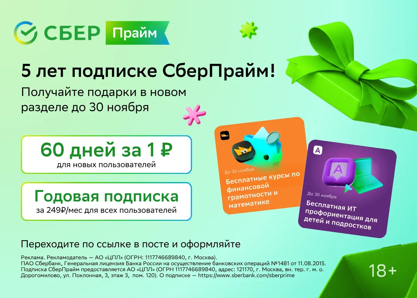 Только до 31 декабря 2025 года действуют специальные условия на подписку СберПрайм. При переходе по ссылке доступно два варианта: новые пользователи могут получить подписку на 60 дней за 1 рубль, а для остальных пользователей предусмотрена годовая подписка стоимостью 249 рублей в месяц.