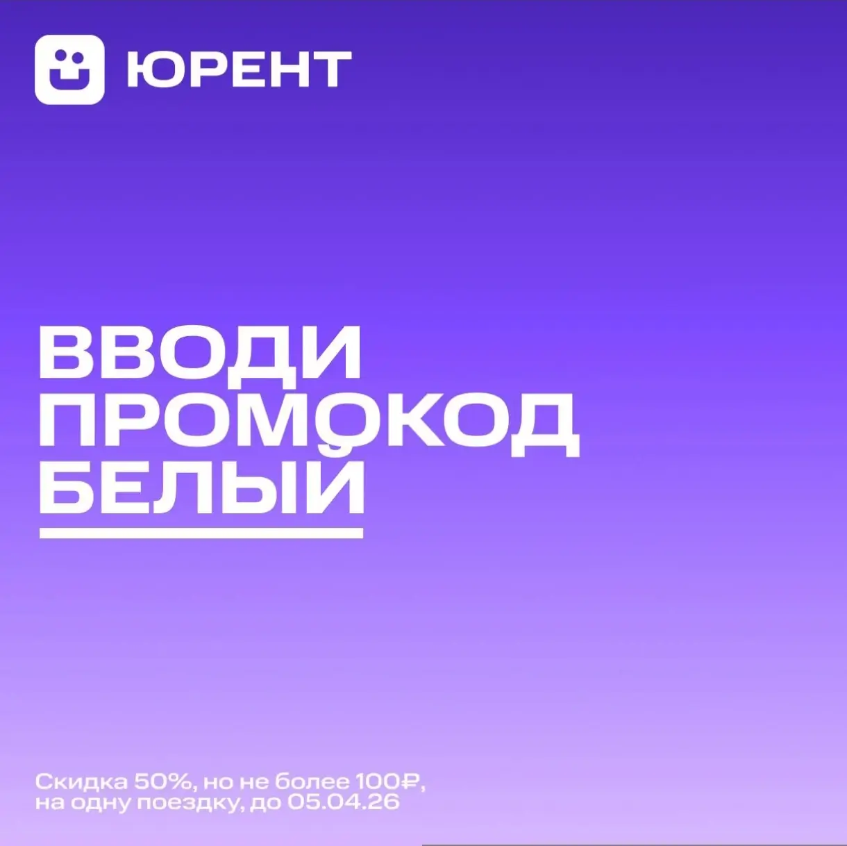 Сервис Юрент дарит всем своим пользователям скидку 50% на одну аренду по промокоду БЕЛЫЙ.