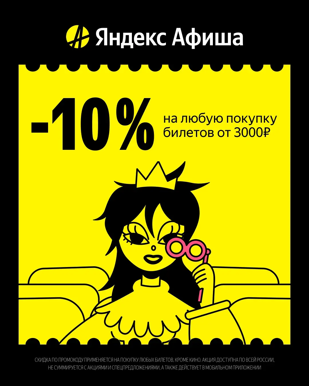 В приложении и на сайте Яндекс Афиши сейчас действует специальное предложение: при заказе любых билетов на сумму от 3000 рублей можно получить скидку 10% по промокоду. Исключение составляют подарочные сертификаты, киносеансы и оплата Пушкинской картой — на эти категории скидка не распространяется.