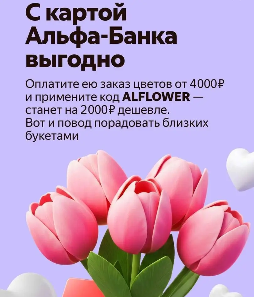 До 9 марта 2026 года в Яндекс Еде действует специальный промокод ALFlower: он предоставляет скидку 2000 рублей при заказе цветов стоимостью от 4000 рублей, если оплачивать покупку картой Альфа-Банка. Важно учитывать, что акция не распространяется на пользователей, которые являются участниками программы Яндекс Пэй.