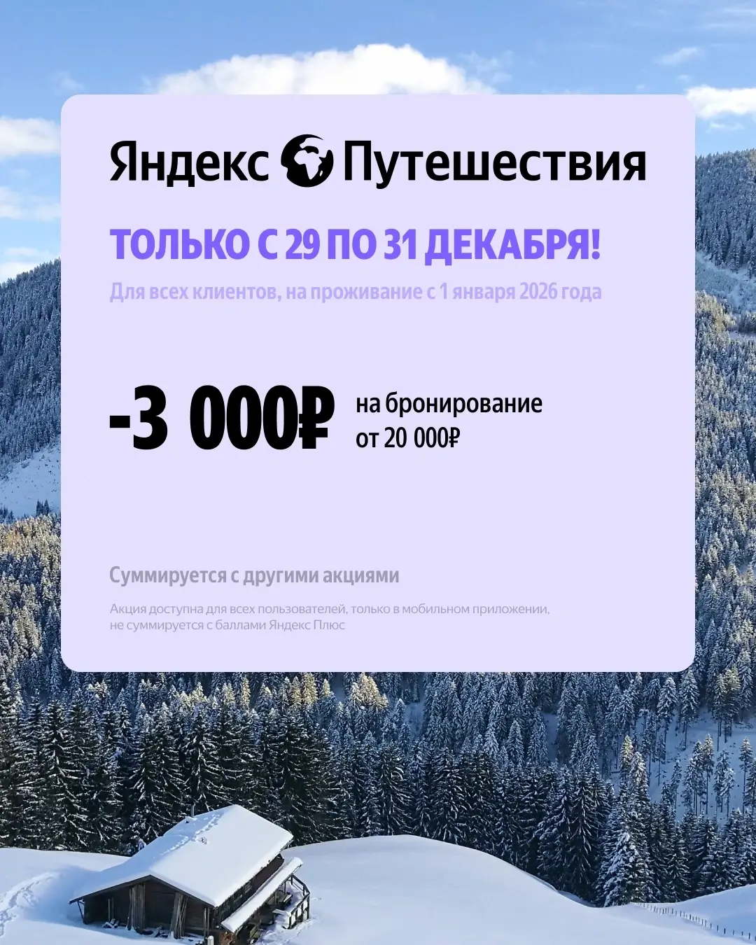 Забронируйте отель через мобильное приложение «Яндекс Путешествия» до конца 2025 года - и получите дополнительную скидку 3000 рублей. Воспользоваться ей можно при оплате любого проживания от 20 000 рублей, которое начнётся с 1 января 2026 года.